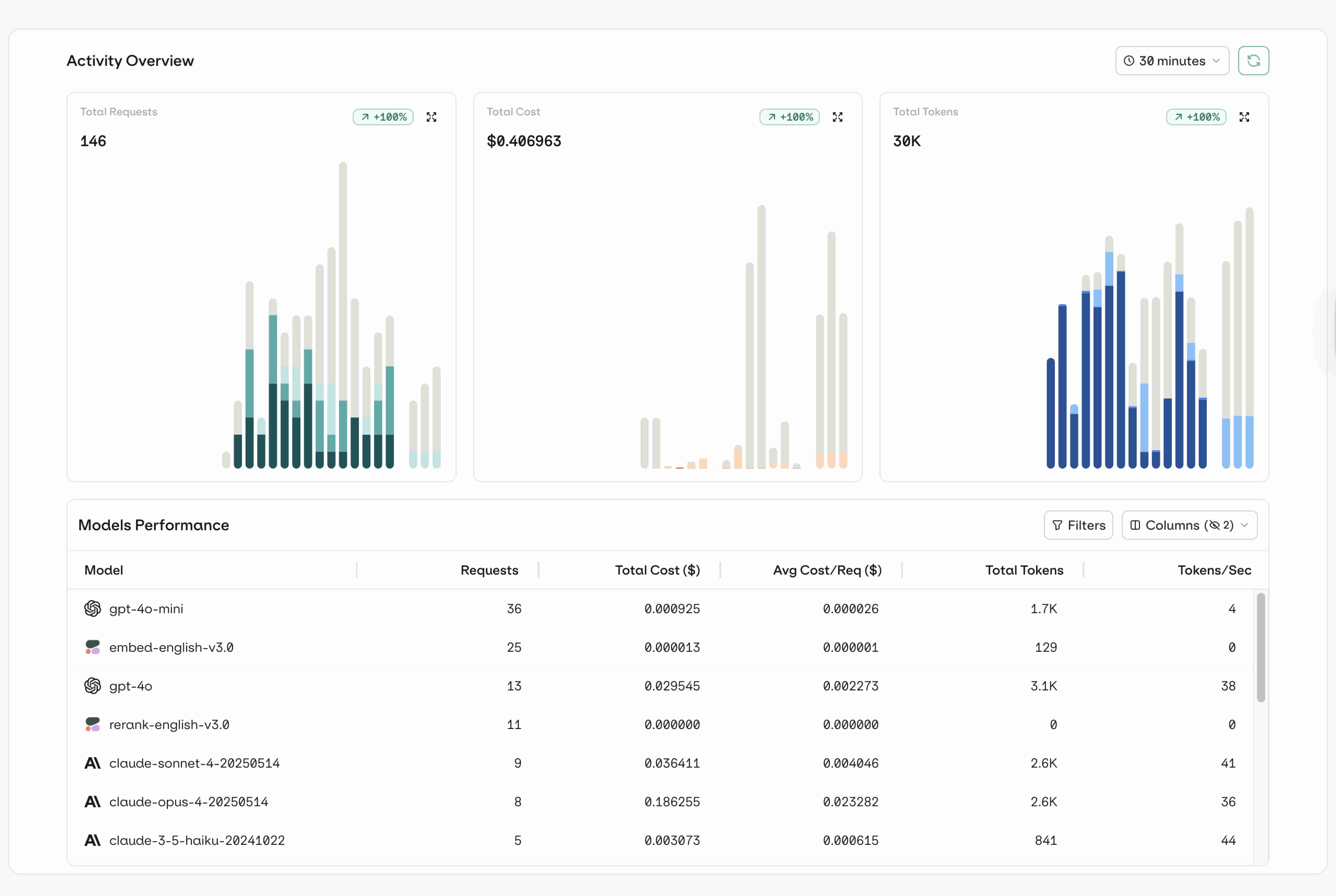 Track tokens and costs in real time, set limits, and optimize spend across models as usage scales – without surprises.