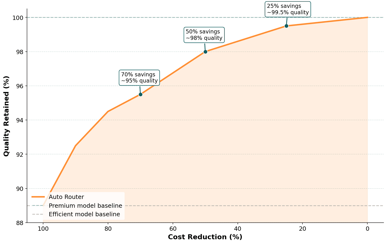 For most production applications, the 50% operating point represents a strong default: 98% quality retention at roughly half the cost. Teams with tighter quality requirements can dial back to 75% premium usage (~25% savings, negligible quality impact). Teams optimizing aggressively for cost can push to 25% premium usage and still retain 95% of quality.